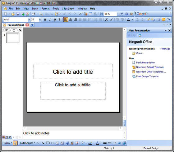 В состав Kingsoft Office входят три ключевых продукта – Kingsoft Writer, Kingsoft Presentation и Kingsoft Spreadsheets. Пользовательский интерфейс всех перечисленных программ сконструирован по образцу инструментальной панели MS Office 2003, хорошо знакомой огромному количеству пользователей пакета от Microsoft. Знакомый интерфейс и совместимость файловых форматов позволяет осуществить переход на Kingsoft Office без предварительной подготовки.