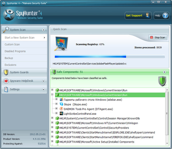 SpyHunter - мощная утилита, которая в режиме реального времени очищает ОС от программ-шпионов, кейлоггеров, резидентных вирусов и при необходимости удаляет следы оставленные ими. Проверяет запущенные процессы, ключи реестра, элементы ActiveX. Имеет весьма дружественный интерфейс, благодаря которому, предельно проста в работе, а внушительная база сигнатур не позволит ни одному шпиону остаться незамеченным.