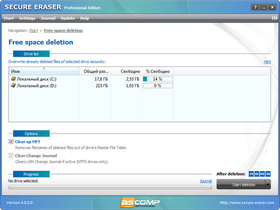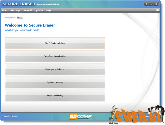 Secure Eraser - основное предназначение программы - удаление конфиденциальной информации пользователя с жесткого диска без возможности восстановления. Программа сразу после удаления информации перезапишет освободившиеся секторы несколько раз производной комбинацией символов, так что для восстановления информации понадобятся специальные аппаратные средства.