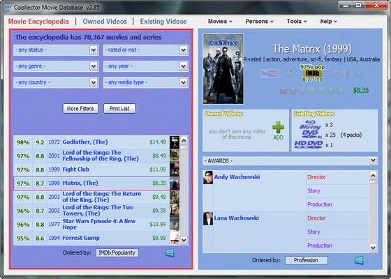 Invelos DVD Profiler - программа для обработки и управления любыми коллекциями DVD с возможностями фильтрации, создания отчетов и доступом к онлайновыми базам данных. При помещении DVD-диска в привод программа автоматически пытается распознать содержимое и добавить его в список, но также способна добавлять диски по различным критериям, вводимыми пользователями индивидуально.
