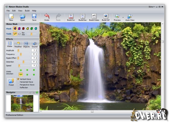 Nature Illusion Studio - программа поможет вам превратить обычные снимки в прекрасные анимированные пейзажи. Программа позволяет накладывать разные графические и звуковые эффекты, и затем конвертировать результат в экранную заставку, исполняемый файл, анимированный рисунок или видео-файл. Загружаете свою любимую фотку с пейзажем, выделяете с помощью масок области, которые нужно оживить (напр. поверхность водоема, ручей, водопад и т.д.), добавляете звук (шум прибоя, пение птиц, журчание воды), можно добавить падающий снег или дождь. Вобщем, теперь вы можете самостоятельно создавать скринсэйверы профессионального качества, делать автоские анимированые GIF на основе ваших фото.