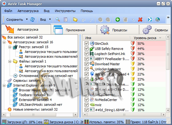 AnVir Task Manager - мощный менеджер процессов и программ автозагрузки с функциями анти-трояна и antispyware. Показывает полную информацию о процессах: dll, окна, соединения, потоки, хендлы, драйвера, версию файла, в трее - загрузку диска и процессора. Мониторит попытки добавления программ в автозагрузку. Позволяет отловить трояны и spyware по своей базе и по результатам анализа. Ускоряет загрузку Windows за счет отложенного запуска программ автозагрузки.