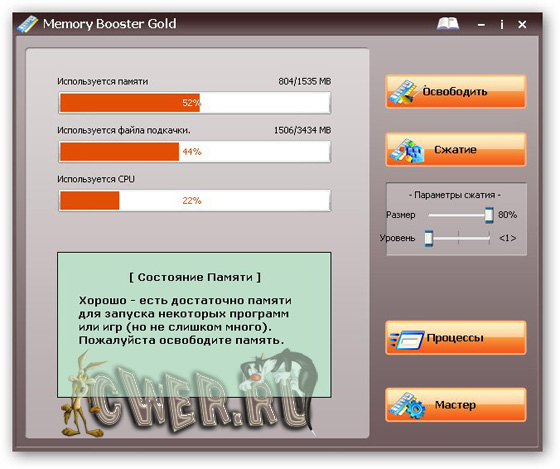 Memory Booster Gold - легкая в использовании утилита для мониторинга и управления системной памятью компьютера. Позволяет уменьшать время загрузки и улучшать производительность приложений, запускаемых в вашей системе. Программа является средством для решения различных проблем с оперативной памятью компьютера. Это богатая возможностями и легкая в использовании программа. Оперативная память является одним из самых главных объектов в компьютере и, если производительность памяти становится низкой, то это может приводить к частым зависаниям системы или уменьшению скорости работы компьютера. Если вы хотите улучшить производительность вашего компьютера или хотите избавится от фрагментации, собранной в вашей системе, то данная программа будет вам очень полезна.