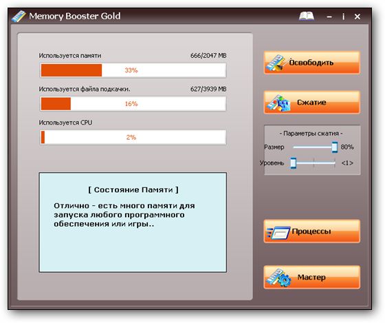 Memory Booster Gold - средство для решения различных проблем, связанных с оперативной памятью компьютера. Это богатая возможностями и легкая в использовании программа. Посредством мониторинга и управлением системной памятью компьютера, позволяет уменьшать время загрузки и повысить производительность вторичных приложений, запускаемых на вашей системе.