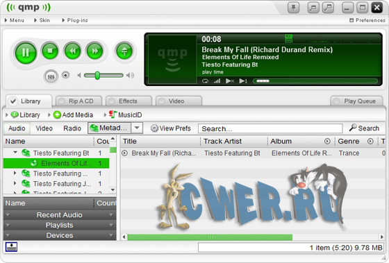 Quintessential Player - аудиоплеер, проигрывающий файлы многих форматов, включая MP3, CD Audio, Ogg Vorbis, WAV, VQF, MP+, Windows Media. Имеет все популярные функции, объединенные привлекательным интерфейсом. Что характерно, интерфейс, в зависимости от используемых функций, изменяет свой размер. Кроме возможности смены скинов, в плеере имеется поддержка CDDB, плейлисты, допустимо использование плагинов, проигрывание музыки сопровождается визуальными эффектами. Есть и полный набор средств управления микшером.