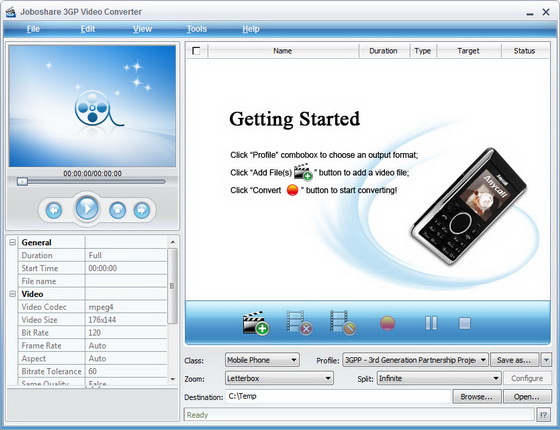 Joboshare 3GP Video Converter - конвертер популярных видео форматов в форматы для мобильных устройств. Программа имеет возможность выбора и настройки параметров конвертирования, пакетный режим конвертирования, предварительный просмотр результата и другие функции.