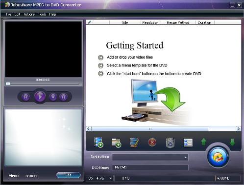 Joboshare MPEG в DVD Converter - программа для создания полноценных видео DVD проектов с прожигом (записью) на DVD носитель. С ее помощью можно легко преобразовать и записывать все популярные видео MPEG файлы, такие как MPEG-1, MPEG-2, MPEG-4, MP4, M2V, MP4, MPG , DAT, VOB на DVD для воспроизведения на домашнем проигрывателе DVD. Вы можете записать ваш DVD, указав битрейд, фреймрейд, кодировку NTSC или PAL, настроить соотношение картинки 4:3 или 16:9, создать меню и субтитры из нескольких десятков блестящих шаблонов для DVD меню, установить фоновую музыку и изображения.