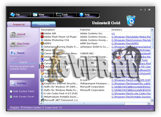 Uninstall Gold - программа для деинсталляции приложений. Обладает большим количеством функций: показывает скрытые установленные программы, сортирует список программного обеспечения по заданному фильтру, удаляет некорректно инсталлированные и деинсталлированные программы.